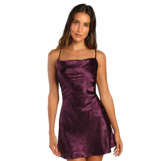 Floral Jacquard Satin Mini Dress With Spaghetti Straps & Cowl Neck