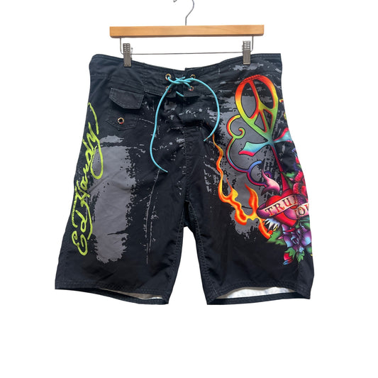 Ed Hardy Christian Audigier Vintage Y2K Black Graphic Swim Trunks Board Shorts
