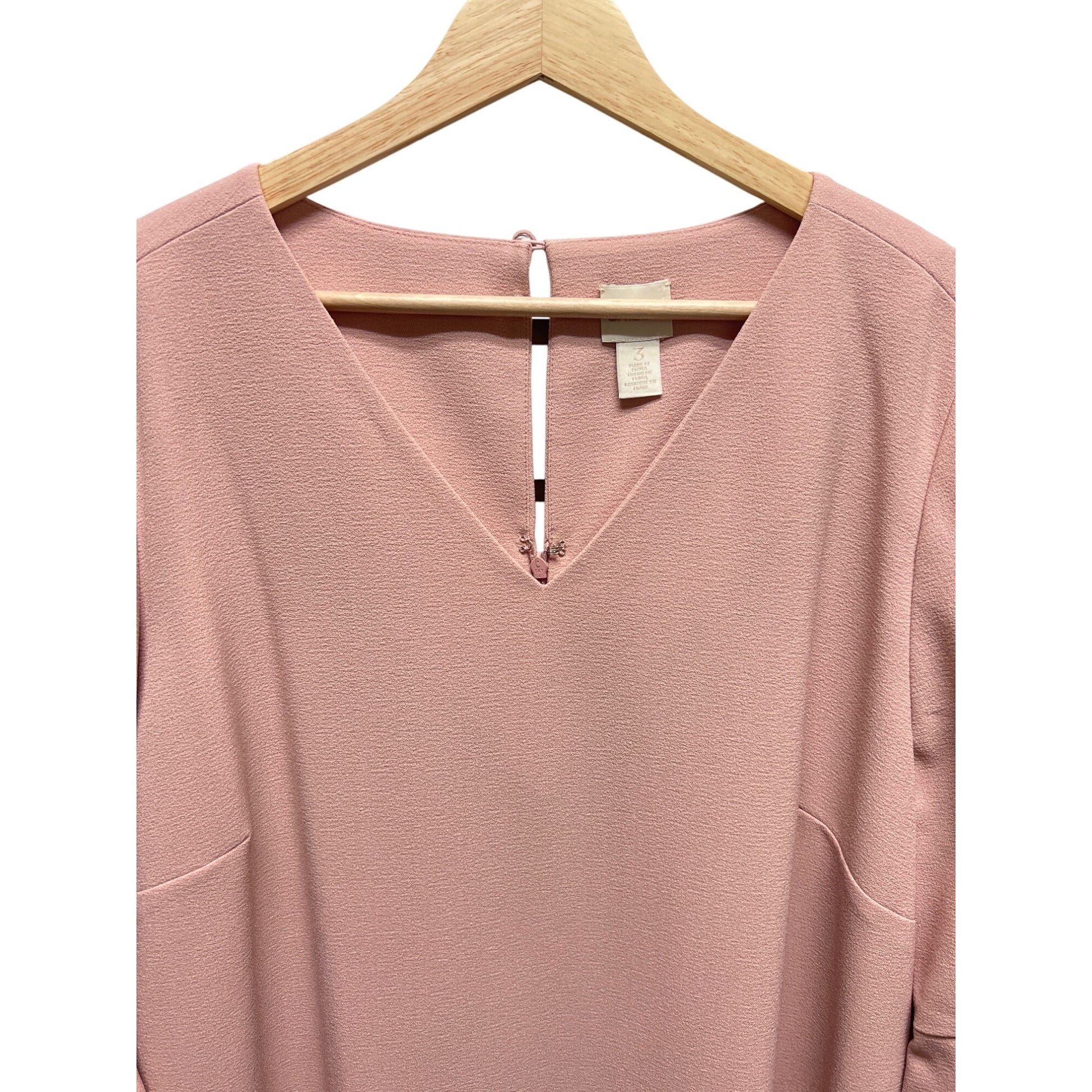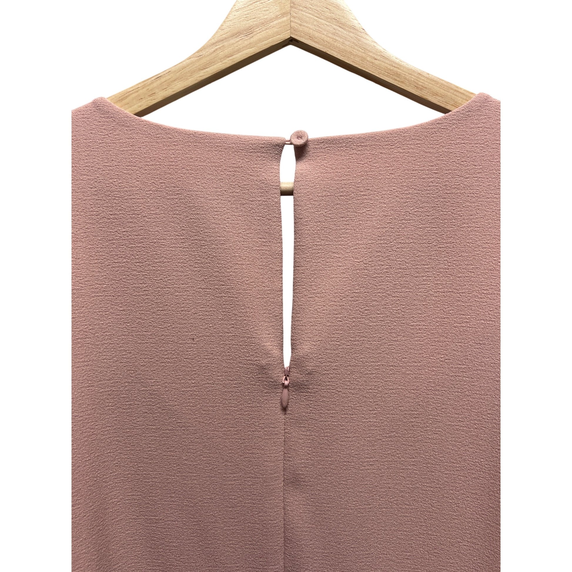 Chic and elegant, this pink crepe shift dress features stylish bell sleeves. Perfect for any occasion, it offers a flattering fit and timeless appeal. Excellent preowned condition!
