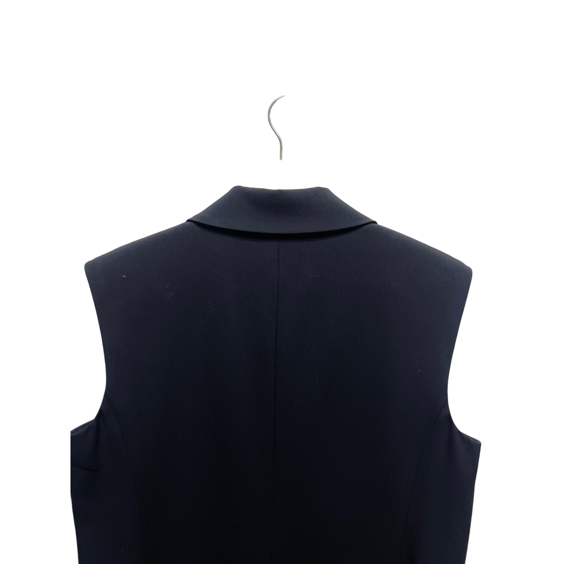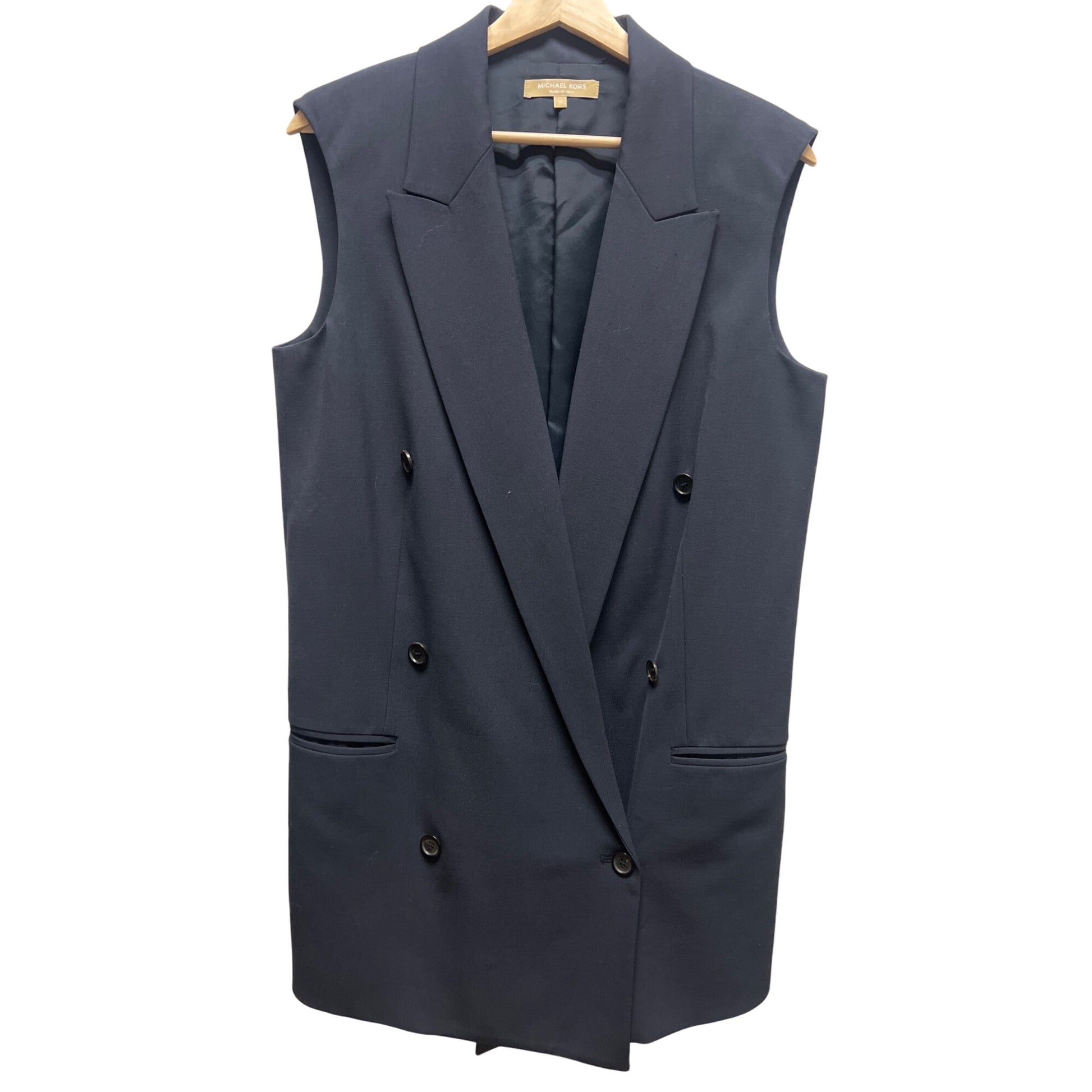 Elevate your style with this Michael Kors navy wool blend vest. Perfect for layering, this long double-breasted design adds sophistication to any outfit, making it a versatile wardrobe staple. Ideal for both formal and semi-casual occasions. Excellent preowned condition!