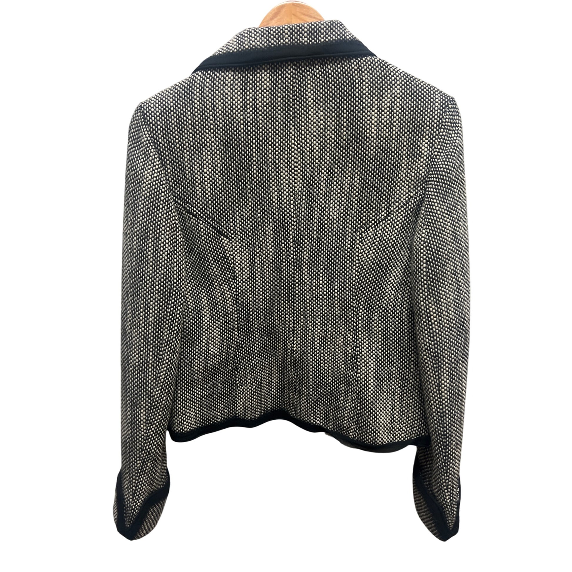A sophisticated blazer featuring a black and gray tweed pattern with elegant floral applique, perfect for adding a touch of class to any outfit. Crafted from a wool blend for warmth and style. Excellent preowned condition!
