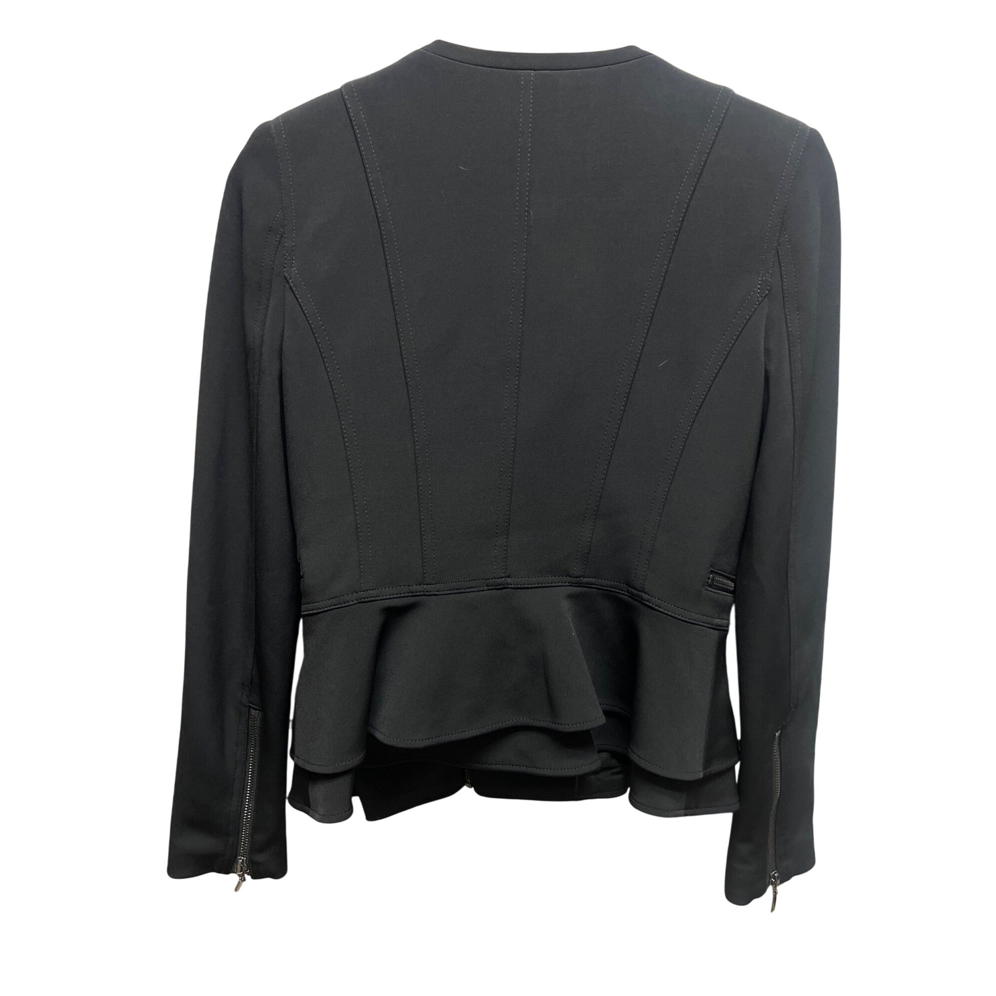 Elevate your style with this sleek black moto jacket featuring a full zip design. Perfect for any occasion, it combines modern flair with timeless elegance for a captivating outerwear essential. Stretchy and comfy! Great preowned condition!